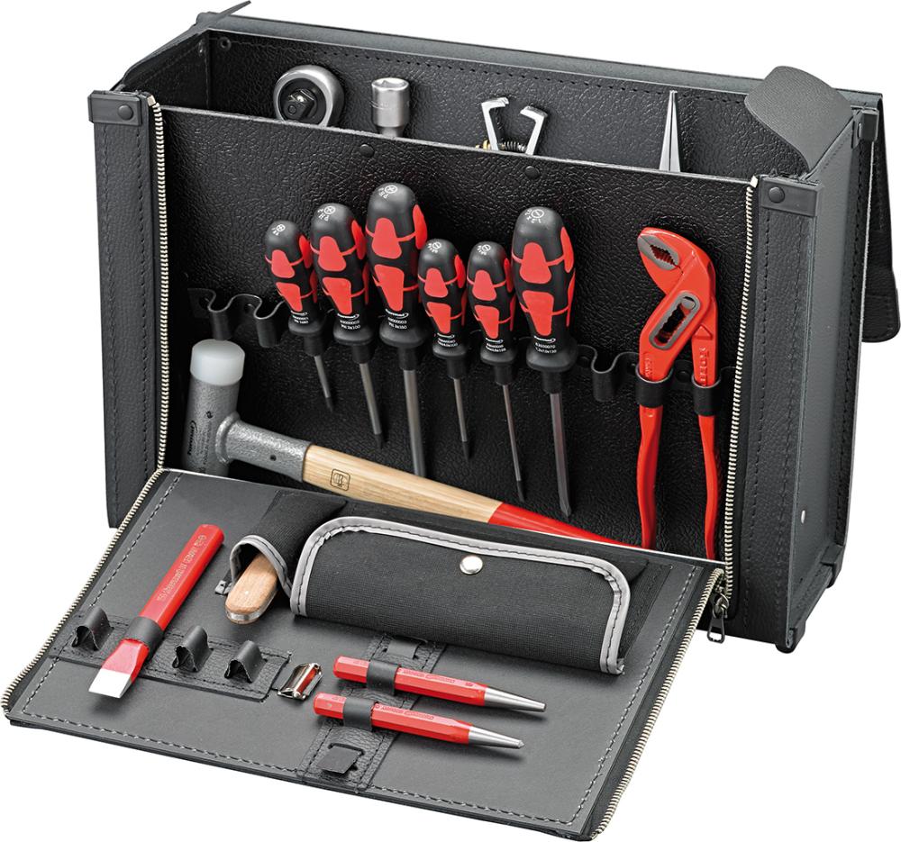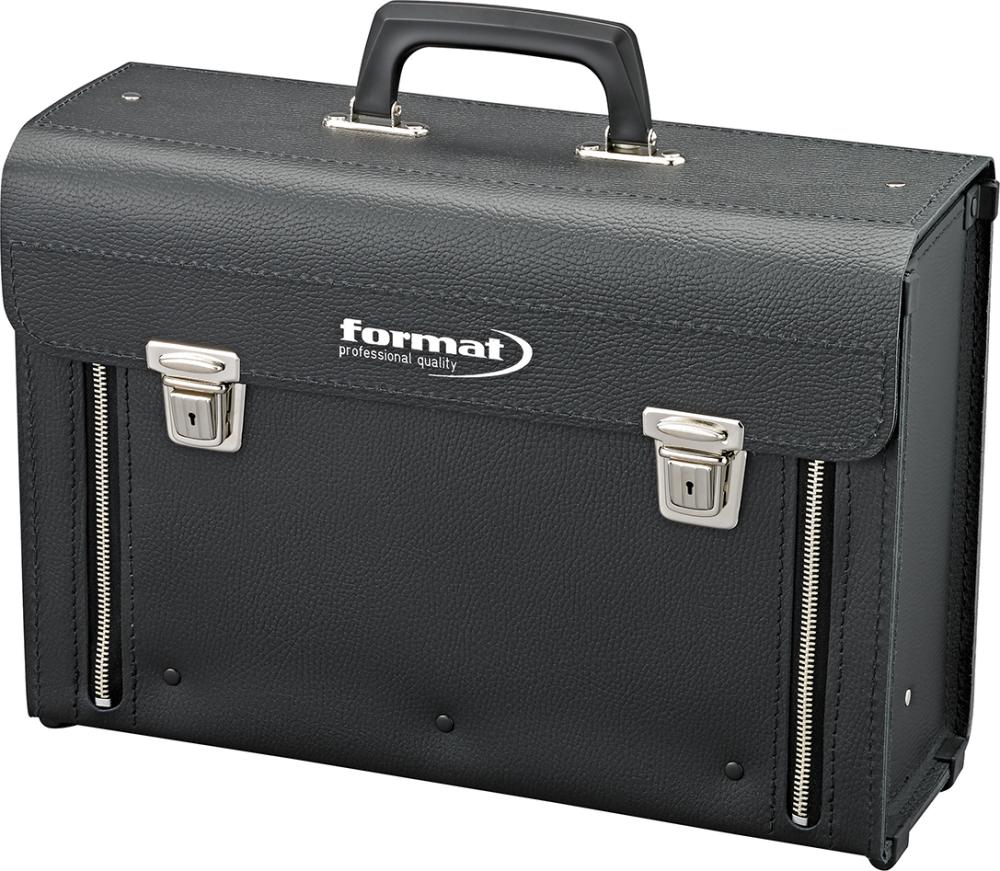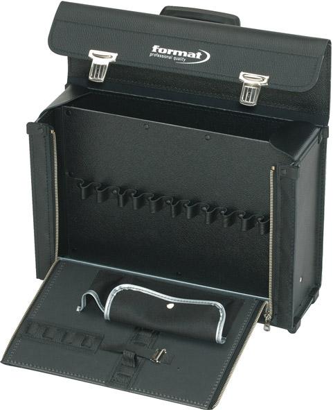 Skořepina dna z ocelového plechu, pozinkovaná, taška a klapka ze silné, ražené hovězí kůže, černé, s madlem na nošení. Velmi stabilní a s ochrannými, integrovanými kluznými lištami. Zamykatelná 2 zástrčnými zámky. Dodává se bez obsahu.