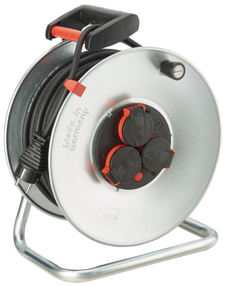 Mimořádně robustní model z pozinkovaného ocelového plechu s antikorozní ochranou a na stabilním podstavci se 3 zásuvkami s ochranným kontaktem, samozavíracími víky s ochranou proti stříkající vodě. Kabelový buben je vybaven ochranou proti přehřátí. Kontrolka reaguje při přehřátí a přetížení. Vedení kabelu na rukojeti umožňuje bezpečné navíjení a odvíjení kabelu.