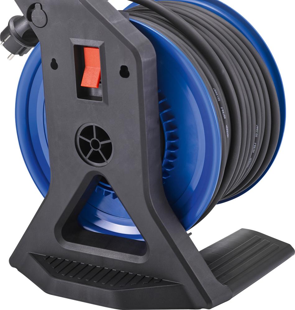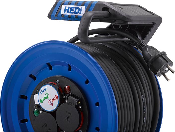 Provedení: Mimořádně robustní model z vysoce pevného plastu s 3 zásuvkami s ochranným kontaktem francouzsko-belgického typu E, ochranou proti stříkající vodě a samozavíracími víky. Tělo bubnu nakloněné o 7° pro lepší přístup a stabilitu. Přídavné otvory umožňují montáž na stěnu. Kabelový buben je vybaven ochranou proti přetížení. Kontrolka reaguje při přehřátí. Kabel je schválený pro ztížené podmínky podle VDE 0100 část 704. Se spínačem zastavení otáčení a odnímatelným vedením kabelu.