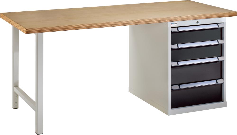 Standardní dílenský pracovní stůl se 4 zásuvkami Vybavení: • Deska dílenského pracovního stolu: Multiplex, tloušťka 40 mm • Zásuvky s plným výsuvem (VA) 100 %, nosnost 75 kg • Úchytková lišta zásuvky s možností popisování • Další barevné kombinace k dodání na vyžádání