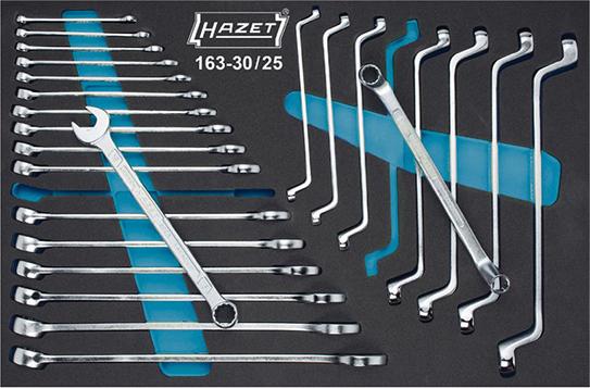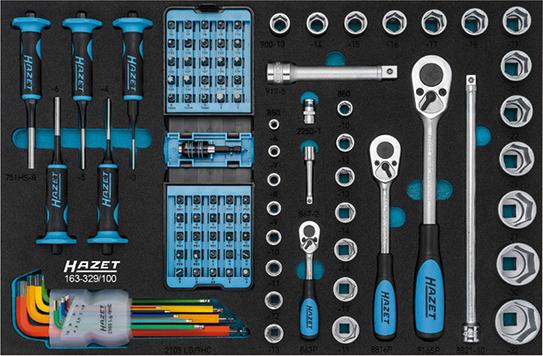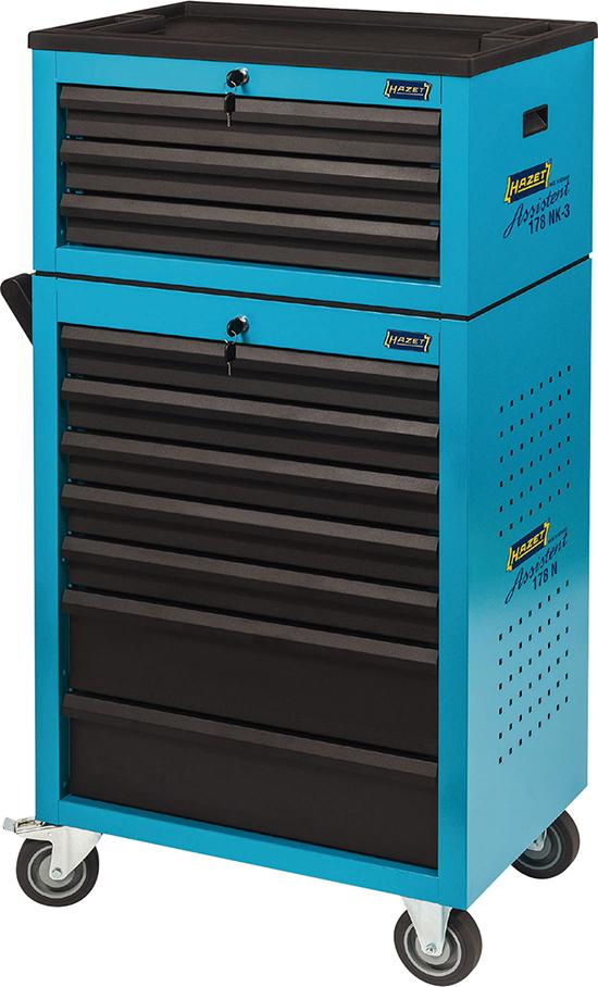 Stabilní konstrukce z ocelového plechu, se 7 zásuvkami vysunutelnými do jedné strany, válečkový výsuv, blokování uprostřed a na konci, jakož i jednotlivé blokování proti nechtěnému otevření během přesunu. Základní výbava obsahuje dělicí plech pro každou zásuvku. Boční stěny mají čtvercové děrování, namontované díly budou chráněny před poškozením zataženými a v rámci rozměrů vozíku namontovanými bočními stěnami. Centrálně uzamykatelný pomocí válečkového zámku. Pracovní deska z plastu odolného proti rozpouštědlům, s přihrádkami pro drobné díly a políčkem pro popsání. S velkými, vysoce zatížitelnými koly s kuličkovým ložiskem (O 125 mm), 2 otočnými kolečky, na jedné straně s brzdou (úplné zastavení) pro pevné zastavení ve všech směrech. Všechna kola jsou vybavena ochranou ložiska, která ložiska chrání před nečistotami a nitěmi. Rohy na ochranu hran v horní a dolní části na všech čtyřech stranách vozíku. Povrch odolný proti poškrábání, práškové lakování, korpus je v modré barvě Hazet, zásuvky jsou černé.