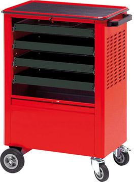 Provedení: Stabilní konstrukce z ocelového plechu se 4 oboustranně vysunutelnými zásuvkami (4 x 45 mm vysoké), kuličkový výsuv a blokování ve středu a na konci. S velkou spodní přihrádkou pro objemné nářadí a oboustranně posuvné dveře z kovu pro zajištění celého vnitřního prostoru. Boční stěny mají čtvercovou perforaci (10 x 10 mm). Centrálně uzamykatelný pomocí visacího zámku. Pracovní deska s žebrovanou plastovou podložkou a ochranu hran z měkké gumy. Vysoká stabilita díky zesílené širokorozchodné zadní nápravě a 2 velkým celogumovým kolům vyčnívajícím na boku, jakož i 2 otočným kolečkům, s brzdou na jedné straně (úplné zastavení). Kromě toho má dílenský vozík po obvodu profilovou lištu jako ochranu hran.