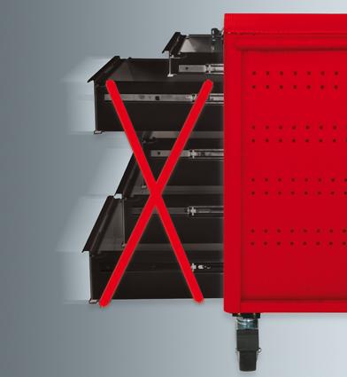 Stabilní konstrukce z ocelového plechu, kuličkový výsuv zásuvek, blokování uprostřed a na konci, jakož i jednotlivé blokování proti nežádoucímu otevření během přesunu. Zadní stěna a boční stěny mají čtvercovou perforaci. Centrálně uzamykatelný pomocí válečkového zámku. Pracovní deska s pěnovou vložkou o tloušťce 10 mm. Vysoká stabilita díky zesílené širokorozchodné zadní nápravě a 2 velkým celogumovým kolům, jakož i 2 otočným kolečkům, na obou stranách s otočnou brzdou koleček (úplné zastavení). Povrch odolný proti poškrábání, práškové lakování, korpus je červený, zásuvky jsou černé. Se 7 zásuvkami vysunutelnými do jedné strany (5 x 75; 2 x 150 mm vysoké), s prostorem pro 4 1/3 moduly.