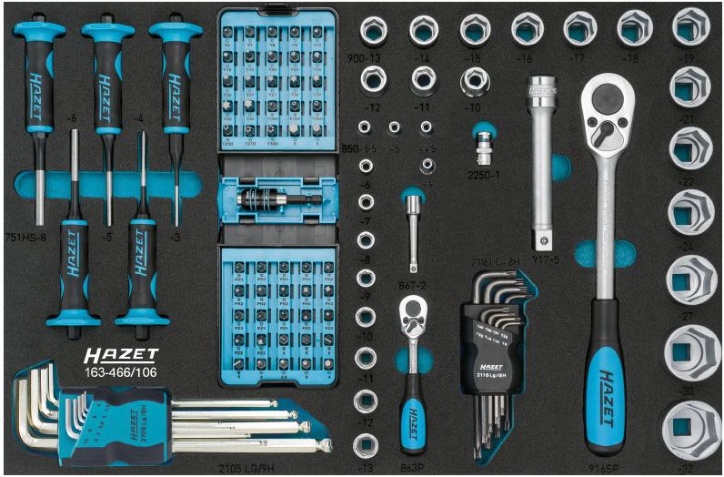 Provedení: Stabilní konstrukce z ocelového plechu, se 7 zásuvkami vysunutelnými do jedné strany (5 x 80; 2 x 165 mm výška), válečkový výsuv zásuvek, blokování uprostřed a na konci, jakož i jednotlivé blokování proti nechtěnému otevření během přesunu. Základní výbava obsahuje dělicí plech pro každou zásuvku. Boční stěny mají čtvercové děrování. Centrálně uzamykatelný pomocí cylindrického zámku. Pracovní deska z plastu odolného proti rozpouštědlům, s přihrádkami pro drobné díly. Se dvěma velkými kolečky uloženými na kuličkových ložiskách pro vysoká zatížení (O 125 mm), 2 otočné kolečky, na jedné straně s brzdami koleček (úplné zastavení) pro stabilitu ve všech směrech. Všechna kola jsou vybavena ochranou ložiska, která ložiska chrání před nečistotami a nitěmi. Povrch s práškovou barvou odolnou proti poškrábání, korpus v modré barvě Hazet, zásuvky v černé barvě.