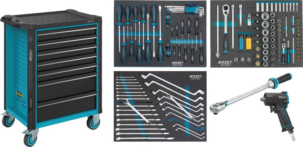 Provedení: Stabilní konstrukce z ocelového plechu, se 7 přihrádkami vysunutelnými do jedné strany (5 x 81; 2 x 166 mm výška), kuličkový výsuv zásuvek, blokování uprostřed a na konci, jakož i jednotlivé blokování proti nechtěnému otevření během přesunu se samozavíráním . Základní výbava obsahuje dělicí plech pro každou zásuvku. Boční stěny mají čtvercové děrování, namontované díly budou chráněny před poškozením zataženými a v rámci rozměrů vozíku namontovanými bočními stěnami. Centrálně uzamykatelný pomocí cylindrického zámku. Se dvěma velkými kolečky uloženými na kuličkových ložiskách pro vysoká zatížení (O 125 mm), 2 otočné kolečky(O 125 mm) na jedné straně s brzdami koleček (úplné zastavení) pro stabilitu ve všech směrech. Všechna kola jsou vybavena ochranou ložiska, která ložiska chrání před nečistotami a nitěmi. Svislá průběžná ochrana hran na všech čtyřech stranách vozidla. Povrch s práškovou barvou odolnou proti poškrábání, korpus v modré barvě Hazet, zásuvky v černé barvě.