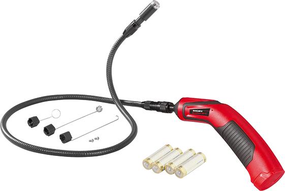 Inspekční kamera, výložníkový kabel 1 m s 16 mm kamerovou hlavou, nástavec pro hák, zrcadlo a magnet, síťový kabel, mikro SD karta 2 GB, transportní kufr, USB kabel, Videokabel, 4 Batterie Mignon AA/LR6 pro ruční přístroj a nabíječku.