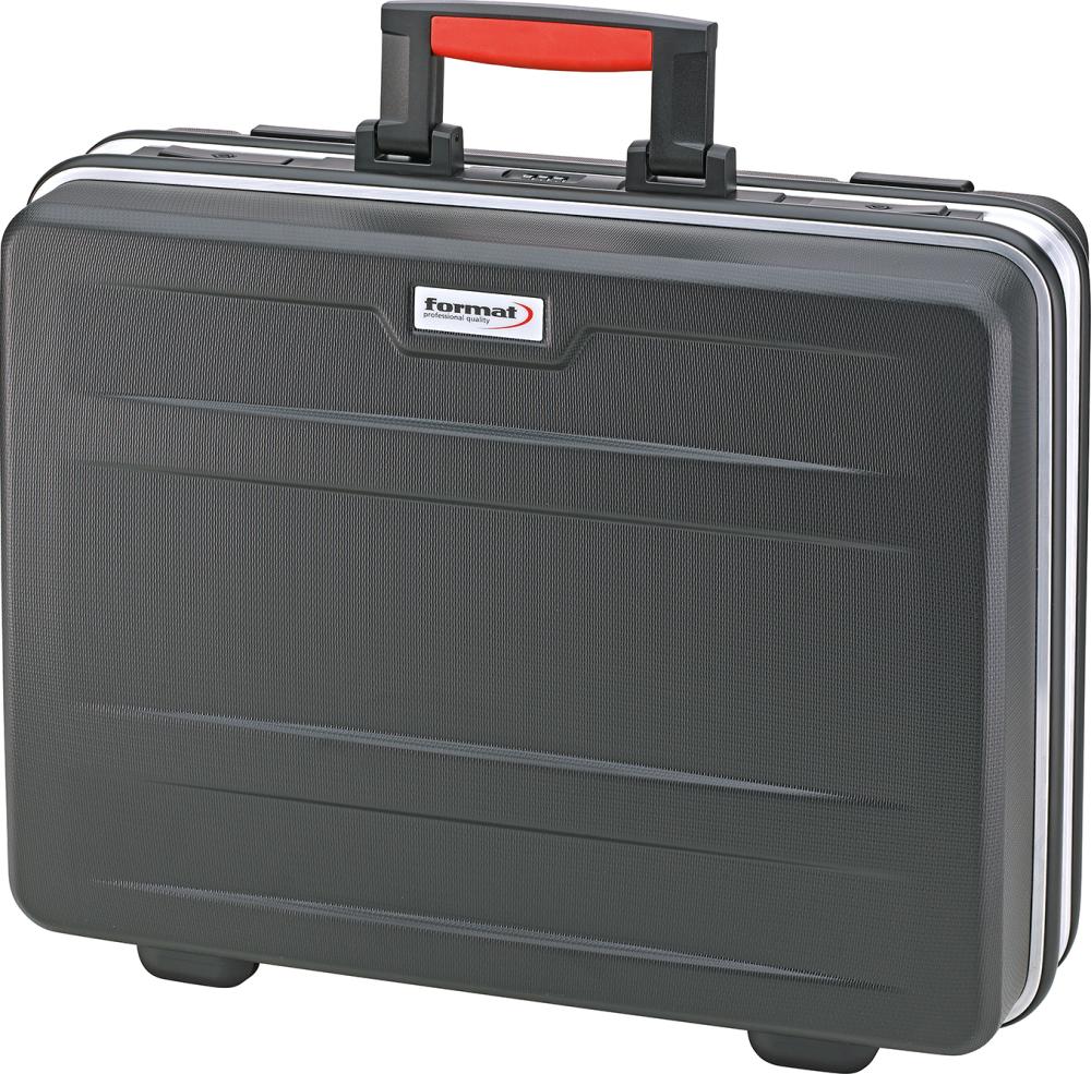 Provedení: Z plastu ABS odolného proti opotřebení a vlhkosti, černého, s pevnými stěnami ze speciálního plastu pro odolnost proti poškrábání, tvarovou stabilitu, a odolnost proti vlhkosti, tukům a chemikáliím, se stabilní rukojetí s komfortními měkkými vložkami. Skořepina dna s výškou 58 mm, volně rozdělitelná. Se skrytými rastrovými závěsy, bezpečnostním držákem víka, kufr zatížitelný až do 25 kg, dvojitý rám z hliníku s ochranou proti nárazu. Velmi stabilní a s ochrannými, integrovanými kluznými lištami. Zamykatelná na 2 klopné cylindrické zámky a 1 kódový zámek. Dodává se bez obsahu.
