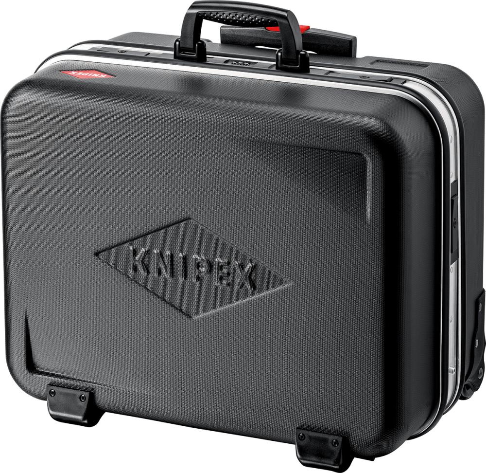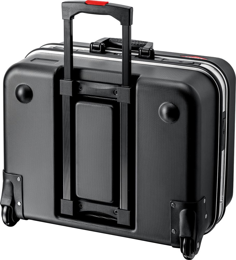 Provedení: Vyrobeno z nárazuvzdorného plastu ABS, obvodový celohliníkový rám s pevně namontovaným středovým panelem, který lze namontovat na obě strany. S vyjímatelnou přihrádkou na doklady, 2 deskami na nářadí z dutých komorových desek z PP, které odpuzují nečistoty, s 13 přihrádkami a poutky. Spodní přihrádka vysoká 58 mm, upevnitelná, volně dělitelná, s krycí deskou a 13 přihrádkami, upevnitelná tlačítkem. Dno a víko lze otevírat nezávisle na sobě. Volně zajištěná ve všech polohách otevření díky aretaci držáků víka s mechanismem závěsů na obou stranách. S teleskopickou rukojetí a 2 kolečky, 4 výklopnými cylindrickými zámky, 1 kombinačním zámkem a popisovacím polem.