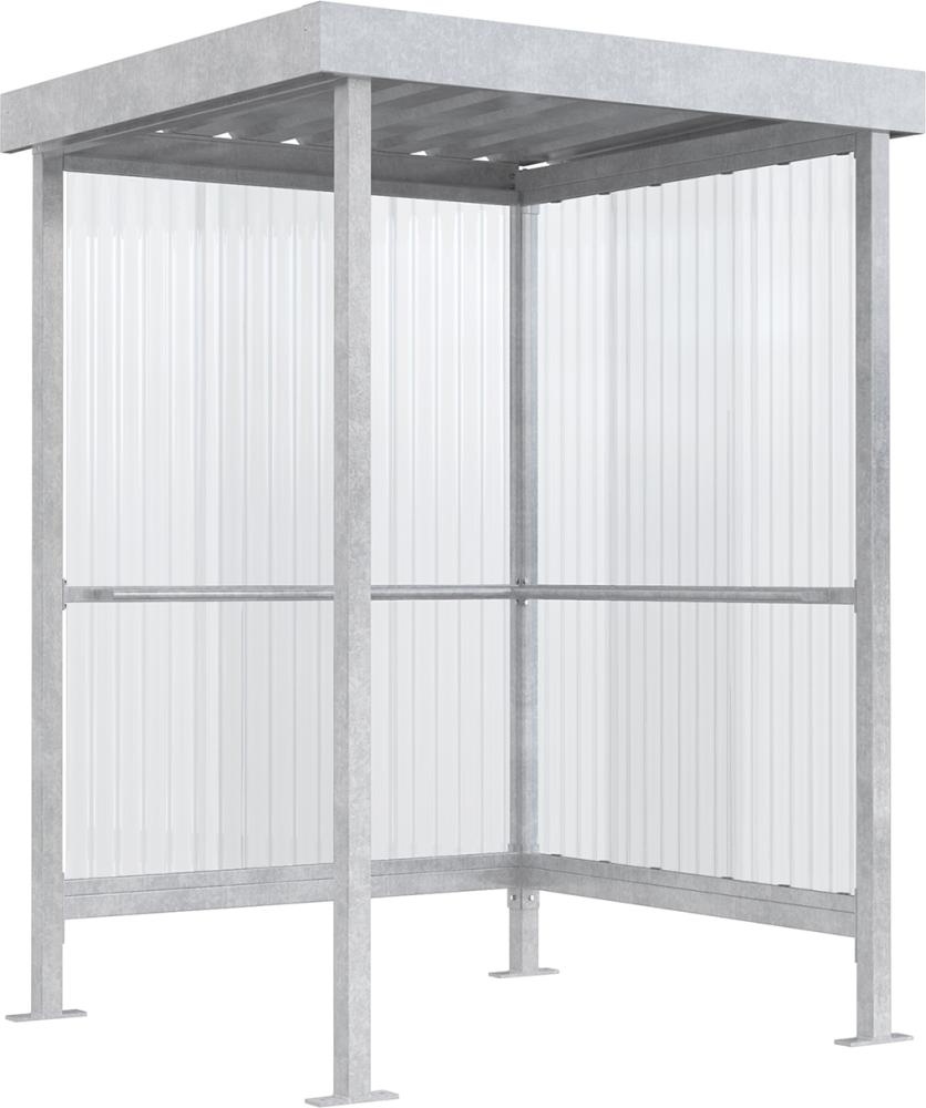Přístřešek pro kuřáky model Jena, pozinkovaný rám Tato kuřárna nabízí rychlou ochranu před povětrnostními vlivy. Je cenově výhodná a snadno ji sestavíte sami. • Šetří místo: jen 2,2 m2 • Ocelová konstrukce: pozinkovaná, chráněná proti korozi • Zadní a boční stěny: z kvalitního vlnitého polykarbonátu • Dodávka: Základní jednotka včetně zadního a bočního panelu s opěrnou konzolou, další boční panel s opěrnou konzolou lze objednat jako volitelné příslušenství. Dodávka formou konstrukční sady s návodem k montáži a plánem základu. Základní jednotka včetně 2 bočních panelů s opěrnou konzolou