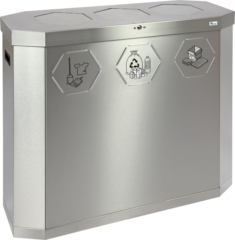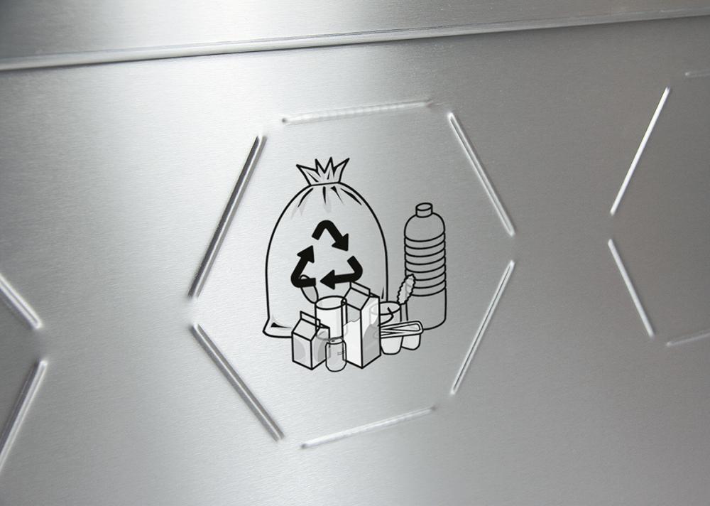 Nádoby na tříděný odpad Sixco Tato funkční nádoba na odpad je kompaktní a vhodná pro použití v jakékoli budově. Při vyjímání vnitřních nádob nebo pytlů s odpadky se odjistí horní část čtyřhranem, odklopí se a je zajištěna plynovou vzpěrou a plynová vzpěra zajistí horní část v odklopené poloze. • Zámek s vnitřním čtyřhranem • 2 kolečka na dně vpředu • Rozsah dodávky: včetně sady piktogramů pro druhy odpadu: směsný odpad, papír, plasty (žlutý pytel) a bioodpad