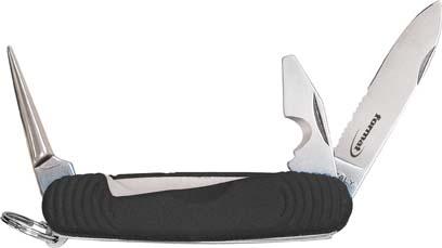 Nůž na kabely (průmyslový), 3dílný, čepel s dvojitým brusem (hladkým/vlnitým) a výstružníkem. Se zářezem a výstružníkem Ergonomická komfortní plastová rukojeť s kroužkem.
