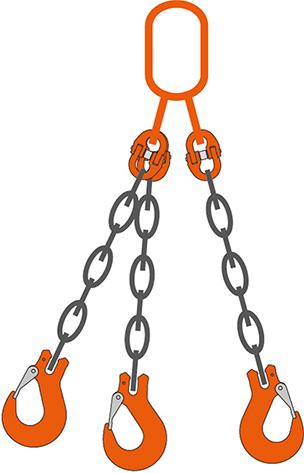 Třípramenný řetězový závěs, závěsný článek typu RM2, spojovací hák RCH, 5250/3750 kg Třípramenný řetězový závěs se spojovacími háky je celý vyroben ve třídě kvality 10. • 3 prameny • Závěsný článek typu RMA • Spojovací hák typu RCH s bezpečnostní západkou • Norma: ČSN EN1677-1 až ČSN EN1677-4, PAS1065, EN818-1-2-4-6