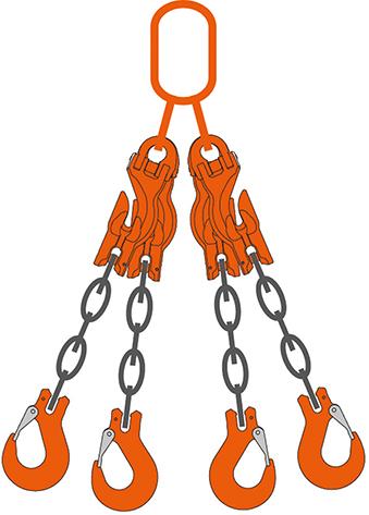 Čtyřpramenný řetězový závěs, typ RMA/RDG/RCH, 5250/3750 kg Čtyřpramenný řetězový závěs se spojovacím hákem je celý vyroben v třídě kvality 10. • 4 prameny • Závěsný článek typu RMA • Zkracovací hák typu RDG • Spojovací hák typu RCH s bezpečnostní západkou • Norma: ČSN EN1677-1 až ČSN EN1677-4, PAS1065, EN818-1-2-4-6