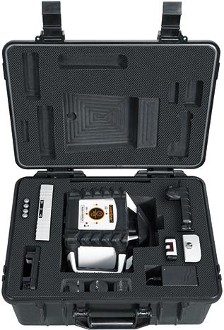 Rotační laser s jednotlačítkovým ovládáním, k horizontální nivelaci na velmi dlouhé vzdálenosti. Robustný vodotěsný kryt. S elektronickými regulačními motory k automatickému horizontálnímu nasměrování pomocí termicky stabilní senzoriky. Samočinná nivelace v rozmezí µ +5°, přesnost µ 0,75 mm na 10 m. Červené laserové paprsky, laserová třída 3R, < 5 mW, detekce laserových linek ručním laserovým přijímačem v poloměru 400 m. Automatické vypnutí při externím ovlivnění. Manuální inklinační režim umožňuje detekci šikmých ploch až do 5°. Ruční laser je vybaven LC displejem na přední a zadní straně, vysoce jasnými tříbarevnými LED signalizačními kontrolkami, jakož i akustickou signalizací výšky laserového paprsku, se silným čelním a bočním magnetem. Speciální motorová brzda poskytuje ochranu přístroje pro transport. Dodáváme: Laserový přijímač, dálkové ovládání, univerzální držák, vysoce výkonný akumulátor, ssíťový zdroj/nabíječku a 4 baby baterie C/LR14, 1,5 V, v plastovém kufříku.