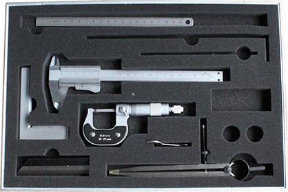 1 Posuvné měřítko 150 mm 1 mikrometr, 0-25 mm 1 vlasový úhelník, 100 x 70 mm, DIN 875/1 1 měřítko 150 x 13 x 0,5 mm 1 příložné pravítko 100 mm, DIN 874/0 1 kružítko 200 mm 1 hloubkoměrný můstek 75 mm 1 rýsovací jehla 250 mm 1 rýsovací jehla z tvrdokovu 150 mmTechnické specifikace se mohou změnit bez výslovného upozornění. Obrázky mají pouze informativní charakter.