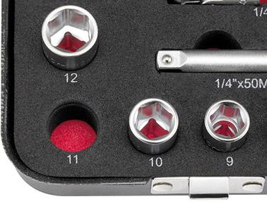 | Provedení | Obsah sady: 1 ráčna s přepínací páčkou 12 hlavic pro šestihranné nástrčné klíče 10;11; 12; 13; 14; 15; 17; 19; 22; 24; 27; 30 mm 7 hlavic šroubováku pro vnitřní šestihran 5; 6; 7; 8; 10; 12; 14 mm 4 hlavice šroubováku s vnitřním |