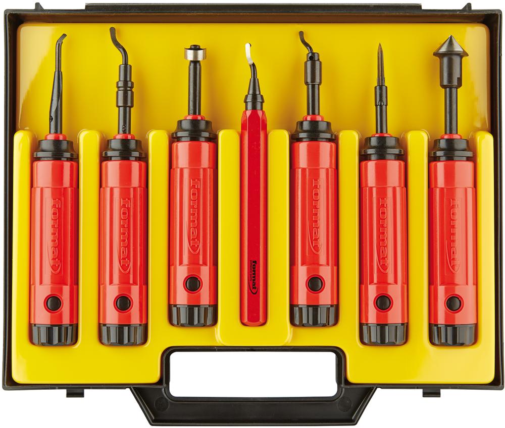 | Provedení | Obsah sady: 1 rychlý odjehlovač EL-RB 1000 1 Sada E EL 1200 1 sada B EL 1100 1 trojhranná škrabka Medium EL 1600 1 odjehlovací záhlubník EL 1300 1 drážkový odjehlovač EL 1400 1 odjehlovač na vnitřní otvory EL 1501 | |