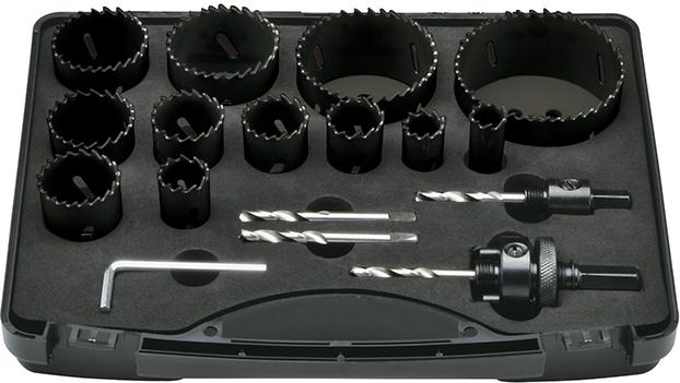 | Provedení | Obsah sady: 12 vykružovacích pil, O 16; 19; 22; 25; 29; 32; 35; 38; 44; 51; 64; 76 mm 2 upínací stopky 2 středicí vrták |