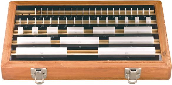 Ze zirkonové keramiky, s extrémně vysokou odolností proti opotřebování a korozi. Každá měrka je označena vlastním samostatným identifikačním číslem. Dodáváme v dřevěném boxu. Třída tolerance 1: Nejčastější použití v místě měření ke kontrole pravítek a k nastavení měřicích přístrojů. Rozměry mm/Odstupnění mm/Počet 1,005/-/1 1,01-1,09/0,0/9 1,10-1,90/0,1/9 1,00-9,00/1,0/9 10,00-30,00/10,0/3 50,00/-/1