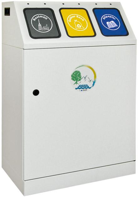 Nádoby na tříděný odpad systému třídění Duplex a Triplex Tyto dvou nebo trojdílné nádoby jsou kompaktní a jsou vhodné do každé budovy. • Zpomalující hoření a nehořlavá podle DIN 4102 • Potlačující zápach • Samozavírací vhazovací klapky • Vyrovnání pomocí nastavitelných nožek v přední části • Vyprazdňování otevřením otočných dveří a vyjmutím vnitřních nádob • Materiál: ocelový plech, pozinkovaný • Povrch: práškový lak, strukturovaná RAL 7035 světle šedá • Piktogram: průhledný s bílým potiskem, „Směšný odpad", „Papír“, „Žlutý pytel“ • Uzavírání: Zámek s vnitřním čtyřhranem, klíč je součástí dodávky