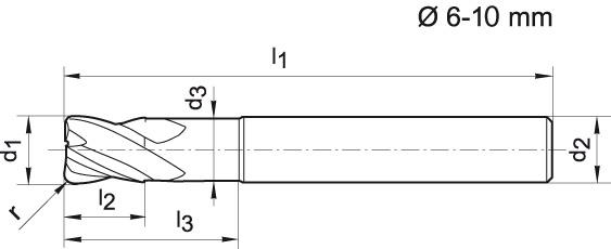 Použití: Pro obvodové frézování. S rohovým rádiusem pro redukci vrubového účinku na obrobek. Vhodná pro HSC obrábění do tvrdosti 62 HRC.