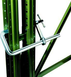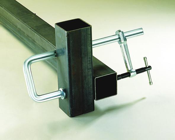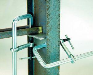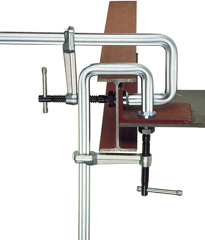 Provedení: Pevný třmen vytvarovaný do tvaru U a s přítlačnou destičkou. Kluznice, pevný třmen a přítlačná destička v jednom kuse ze staticky optimalizované, za studena extrudované profilové oceli, kluzný třmen z kované a galvanicky pozinkované, zušlechtěné oceli, vřeteno se snadným chodem s válcovaným, kaleným a fosfátovaným trapézovým závitem. Vysoce výkonná přítlačná destička s odolností proti vysokým teplotám, s velkou hlavou hřebíku, výklopná do 35°, lze vyměňovat, s tvrzenou a olejem impregnovanou sintrovanou ocelovou vložkou. S průchozí pákovou klikou.