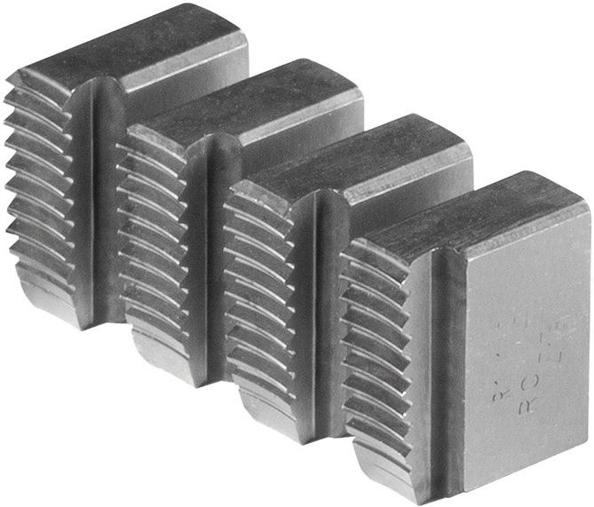 4 závitořezné čelisti, z tvrdé houževnaté speciální oceli pro extrémně dlouhou trvanlivost. Pro rychlovýměnné závitořezy Central a rychlovýměnné závitořezné hlavy S.